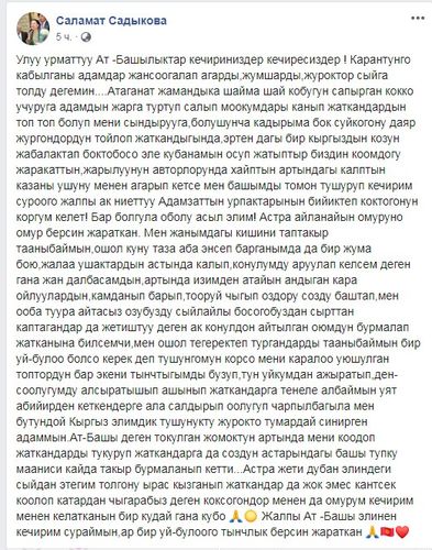 Позже Саламат Садыкова опубликовала пост, где попросила прощения у всех жителей Ат-Башинского района. По ее словам, она не знает тех, кто был рядом с ней.