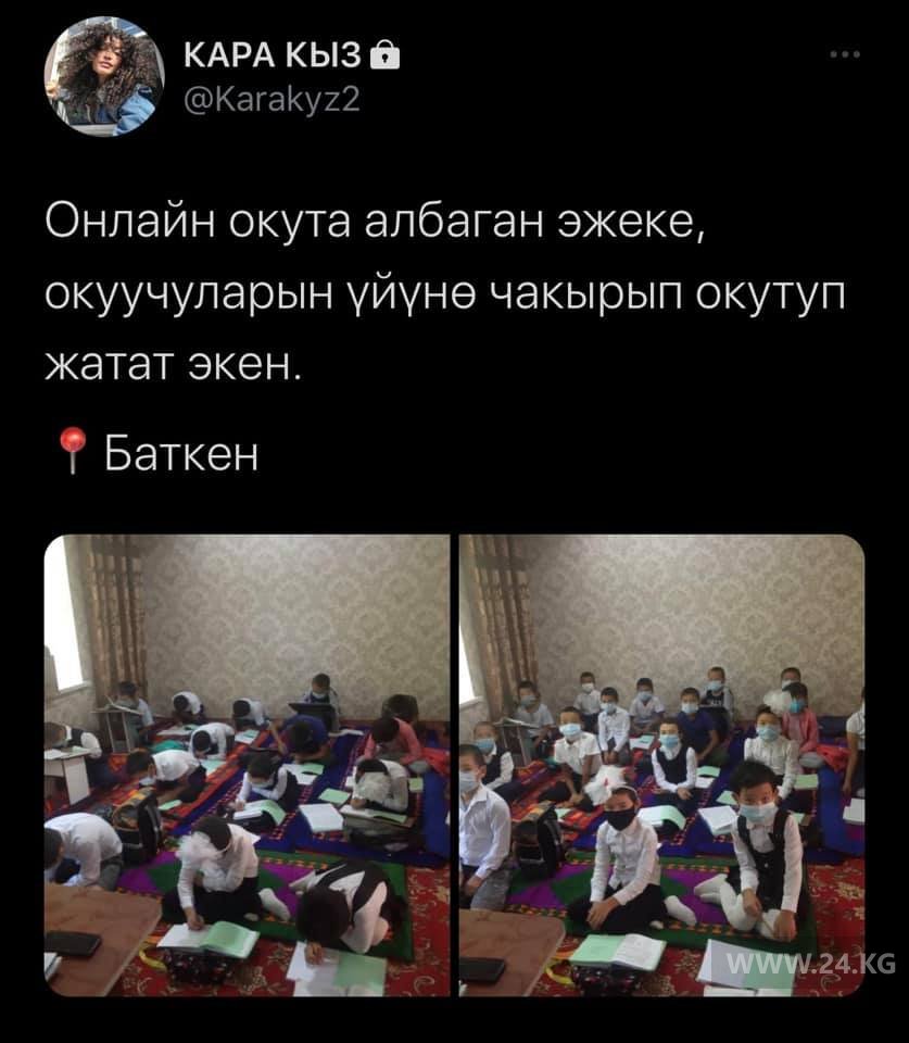 В Баткене учитель вынуждена заниматься с детьми у себя дома, поскольку не у всех есть возможность обучаться онлайн. Об этом в микроблоге Twitter сообщила пользователь под ником Кара кыз.