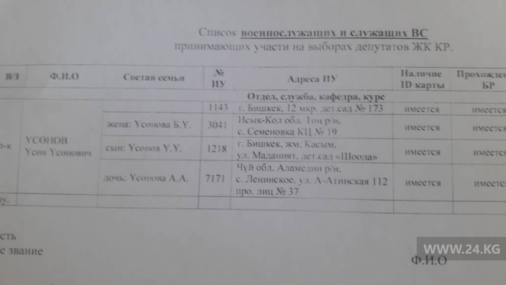 В ЦИК 24-kg.com сообщили, что силовики составляют список избирателей на законных основаниях. По данным ведомства, военнослужащие и правоохранители подпадают под особую категорию избирателей.