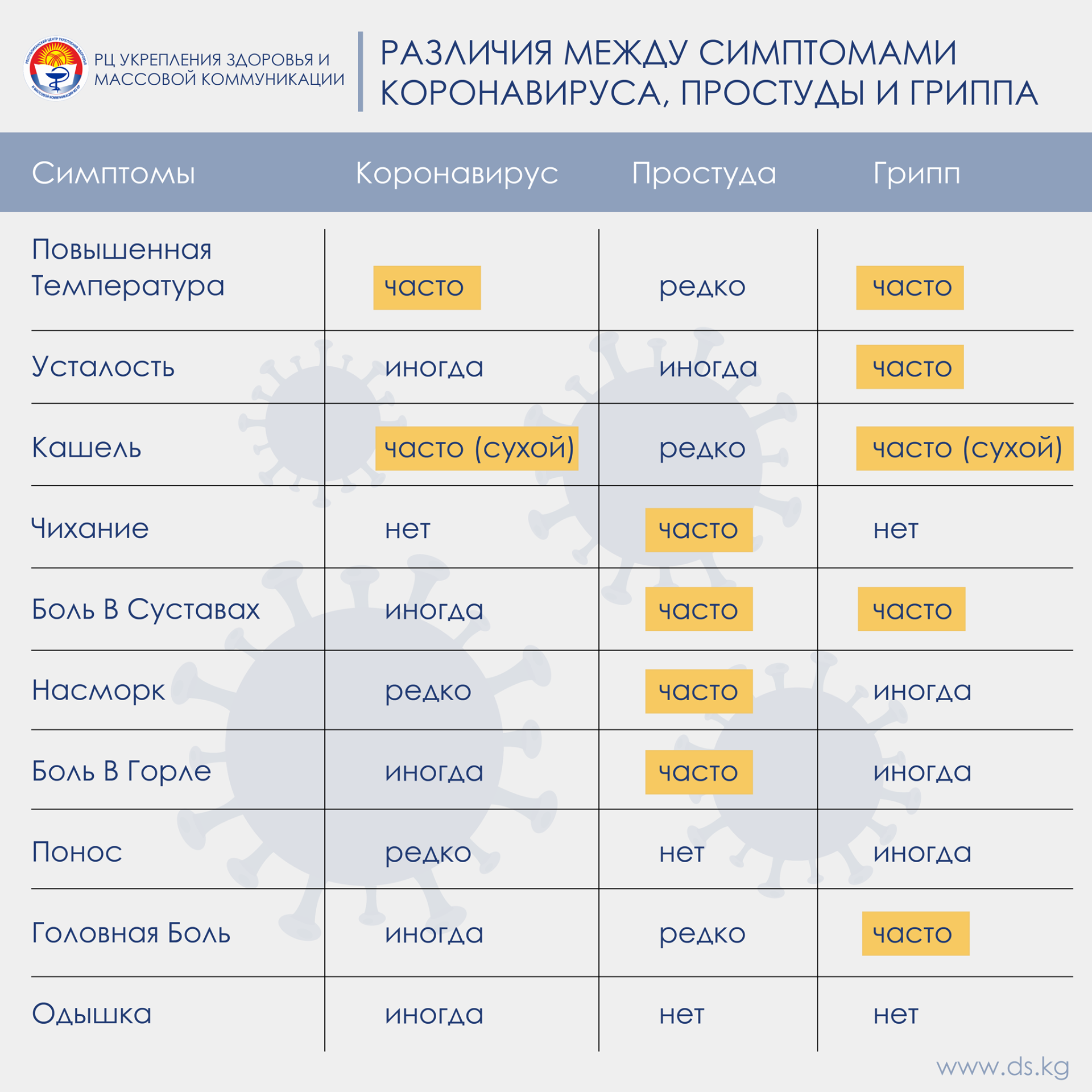 Ключевым элементом в распространении гриппа является передача инфекции в течение первых 3-5 дней болезни и, возможно, до появления симптомов заболевания. С другой стороны, хотя поступают сведения, что у некоторых больных COVID-19 вирусовыделение может возникать за 24–48 часов до возникновения симптомов, в настоящее время оно не играет столь важной роли в распространении инфекции.