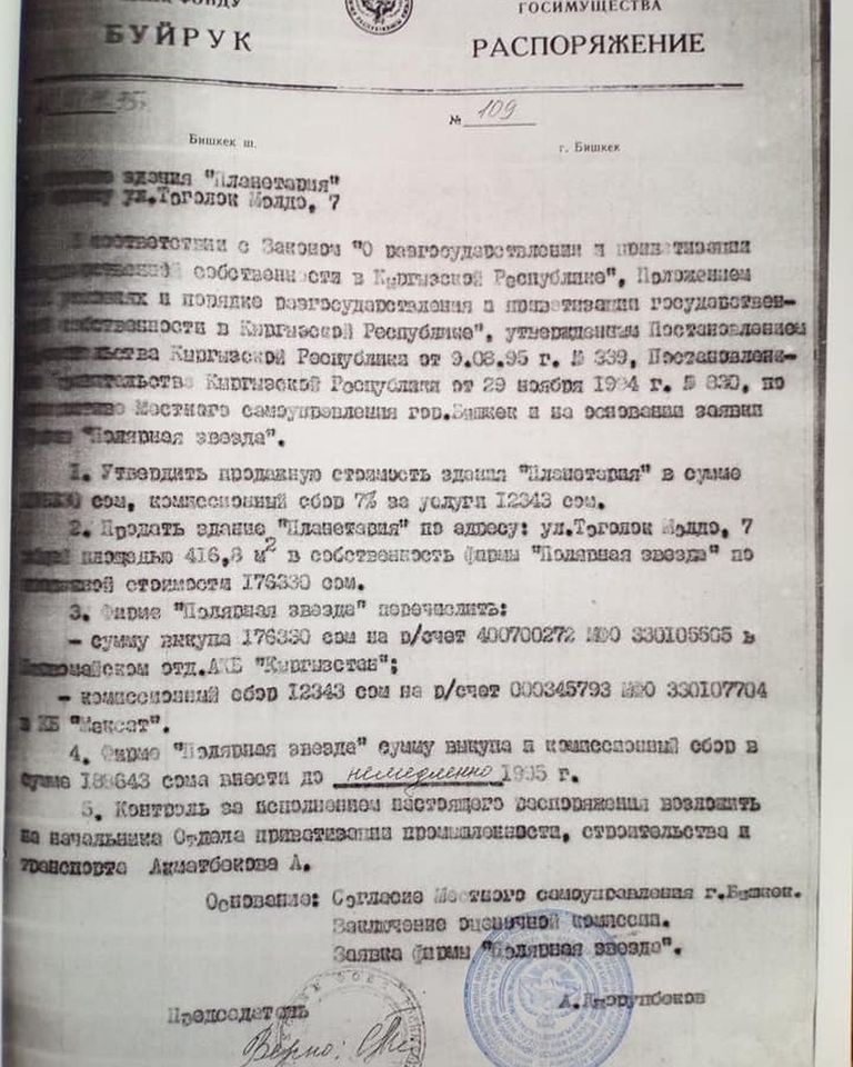 «Но де-факто оказалось все по-другому. Там был ночной клуб, кафе, здание неоднократно перепродавалось. Несколько лет назад его владельцем стал сын экс-спикера Чыныбая Турсунбекова. Насколько нам известно, на этом месте они хотели построить гостиницу под мировым брендом. Но по многим параметрам строительство там отеля будет не самым хорошим решением с точки зрения городского планирования. Здание планетария находится рядом с охранной зоной, где любое крупное строительство запрещено», — отметил он.