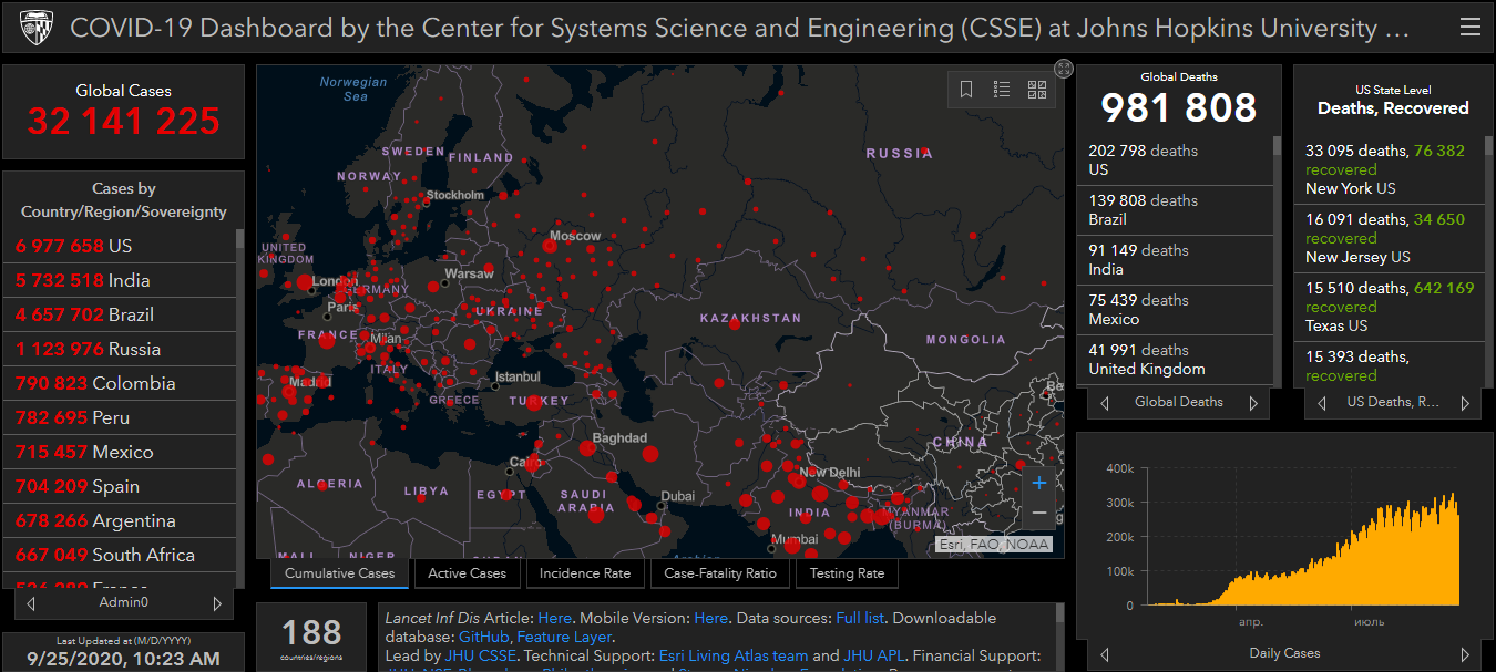 Всего в мире коронавирусом заразились 32 миллиона 779 тысяч 835 человек. Больше всего зараженных в США (6 миллионов 977 тысяч 658), Индии (5 миллионов 732 тысячи 518), Бразилии (4 миллиона 657 тысяч 702), России (1 миллион 123 тысячи 976), Колумбии (790 тысяч 823), Перу (782 тысячи 695), Мексике (715 тысяч 457), Испании (704 тысячи 209) и Аргентине (678 тысяч 266).
