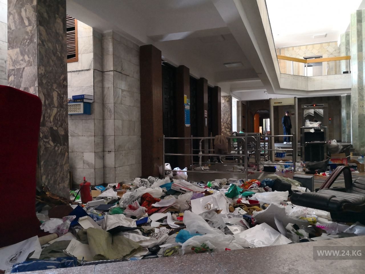 Во всех помещениях царит хаос. Добровольцы со всего Кыргызстана продолжают охранять здание от мародеров.