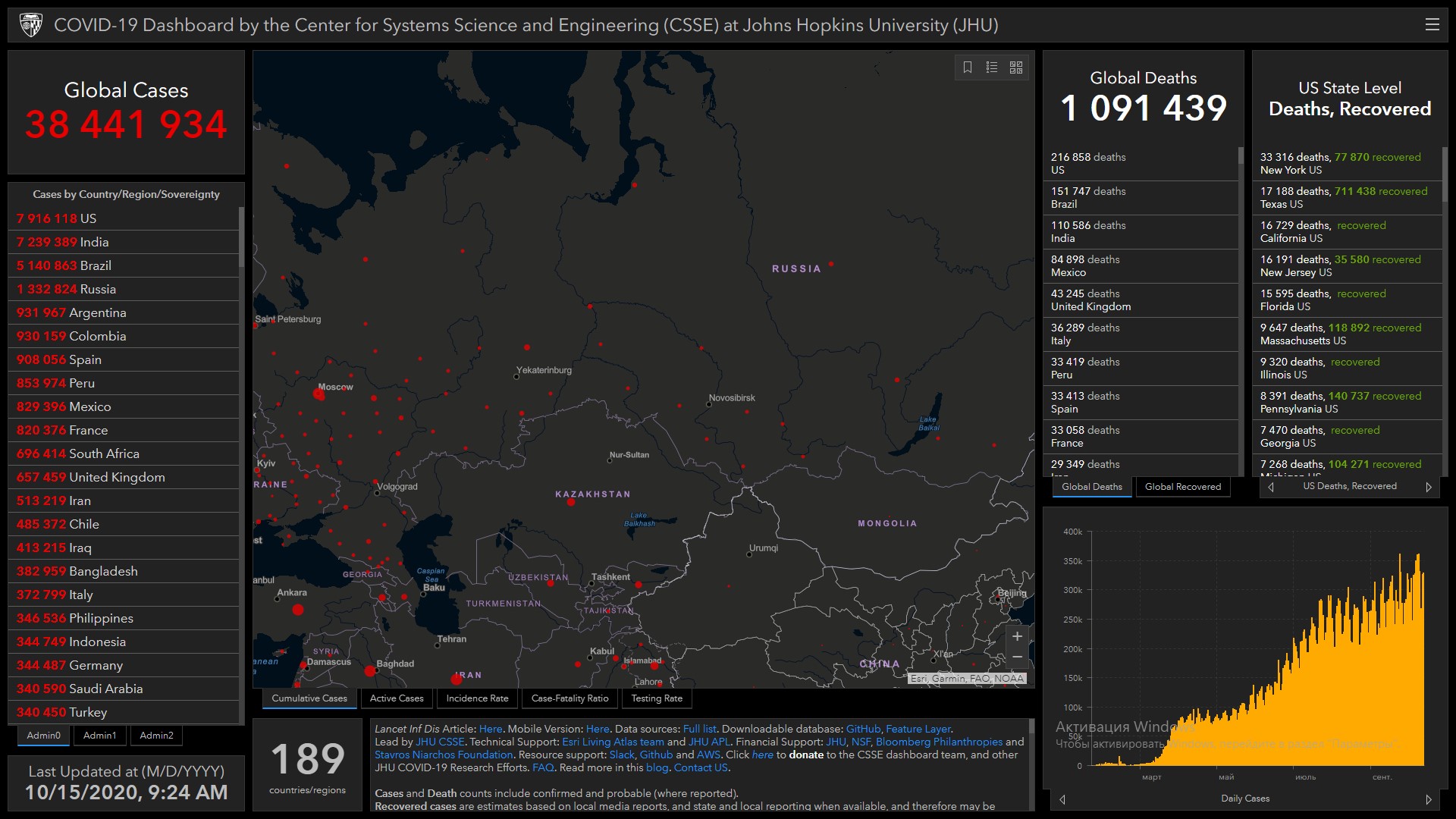 Всего в мире коронавирусом заразились 38 миллионов 441 тысяча 934 человека. Больше всего зараженных в США (7 миллионов 856 тысяч 714), Индии (7 миллионов 239 тысяч 389), Бразилии (5 миллионов 140 тысяч 863), России (1 миллион 332 тысячи 824), Аргентине (931 тысяча 967), Колумбии (930 тысяч 159), Испании (908 тысяч 56), Перу (853 тысячи 974) и Мексике (829 тысяч 396).