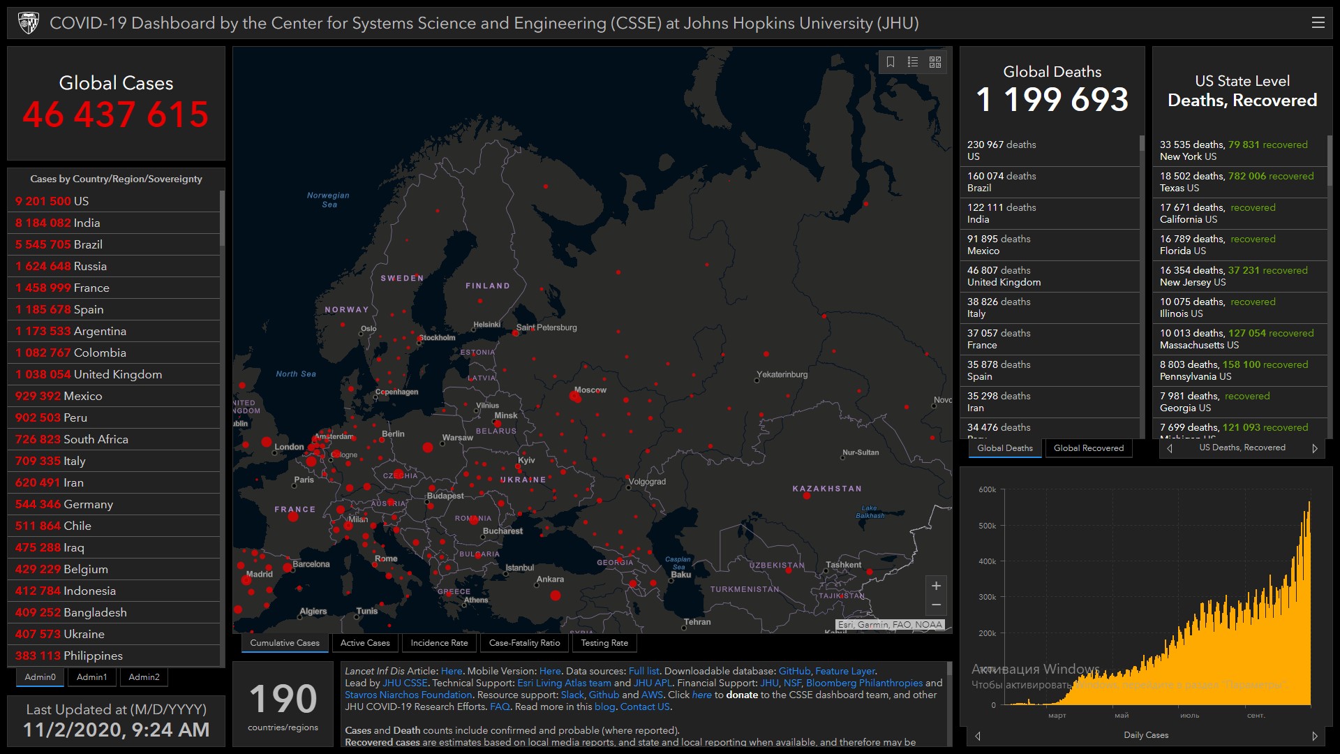 Всего в мире коронавирусом заразились 46 миллионов 437 тысяч 615 человек. Больше всего зараженных в США (9 миллионов 201 тысяча 500), Индии (8 миллионов 184 тысячи 82), Бразилии (5 миллионов 545 тысяч 705), России (1 миллион 624 тысячи 648), Франции (1 миллион 458 тысяч 999), Испании (1 миллион 185 тысяч 678), Аргентине (1 миллион 173 тысячи 533), Колумбии (1 миллион 82 тысячи 767), Великобритании (1 миллион 38 тысяч 54) и Мексике (929 тысяч 392).
