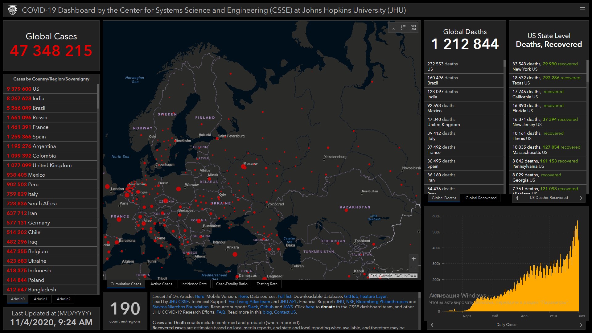 Всего в мире коронавирусом заразились 47 миллионов 348 тысяч 215 человек. Больше всего зараженных в США (9 миллионов 379 тысяч 600), Индии (8 миллионов 267 тысяч 623), Бразилии (5 миллионов 566 тысяч 49), России (1 миллион 661 тысяча 96), Франции (1 миллион 461 тысяча 391), Испании (1 миллион 259 тысяч 366), Аргентине (1 миллион 195 тысяч 276), Колумбии (1 миллион 99 тысяч 392), Великобритании (1 миллион 77 тысяч 99) и Мексике (938 тысяч 405).