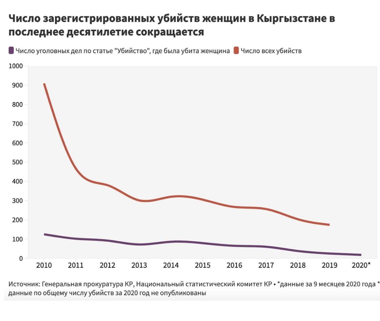По данным Генеральной прокуратуры, с 2010 года по сентябрь 2020-го возбуждено 762 уголовных дела по статье «Убийство», где жертвой стала женщина.