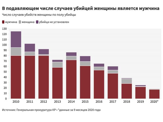 Подавляющее количество убийств женщин в республике было совершено мужчинами — в среднем восемь из десяти убийств. Об этом говорится в исследовании журналисток Анны Капушенко и Савии Хасановой «Фемицид. Кто и как убивает женщин в Кыргызстане?»
