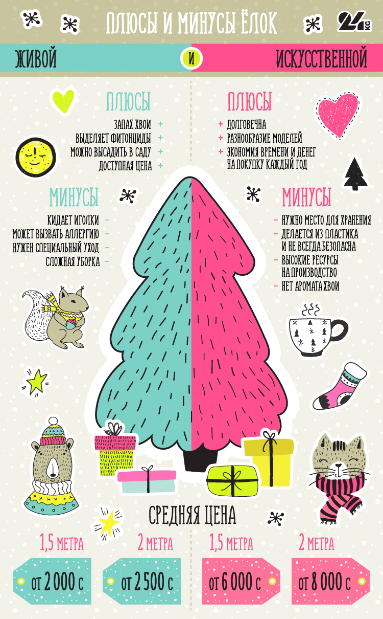 Настоящая живая ель — это полностью натуральная вещь, да к тому же с полезными свойствами (выделяет фитонциды).Продаются такие деревья в горшках или с комом земли. Срубленные, разумеется, брать не рекомендуется, в том числе в целях предупреждения незаконной вырубки леса. В Бишкек товар завозят из питомников и продают его на зеленых базарах.