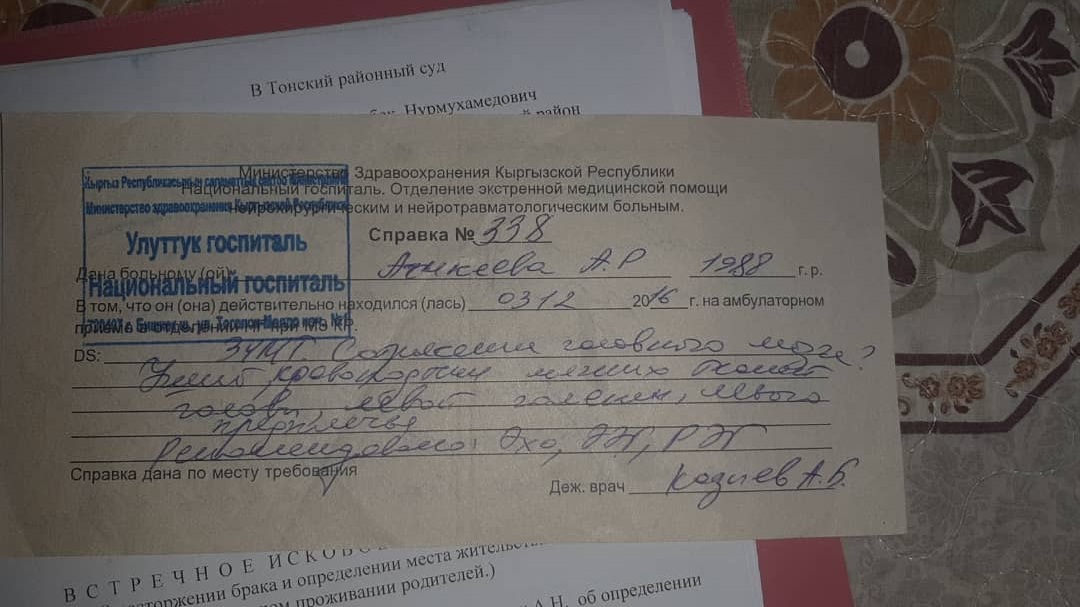 «После этого Асель с детьми уехала в Москву к своей матери, устроила двух старших в школу. Они жили с ней ровно год. Вскоре встал вопрос о получении паспортов, для этого нужно было разрешение отца. Бакыт требовал, чтобы она вернула детей. Она привезла их для оформления документов, и с тех пор он не отдает детей, ссылаясь на то, что они должны расти у себя на родине, дома. Бывшая свекровь тоже вмешивается и не желает отдавать внуков, просит Асель оставить их всех в покое», — подчеркивает адвокат.Пострадавшая от рук мужа решилась и подала в суд на бывшего супруга, требуя вернуть детей. Однако Тонский районный суд Иссык-Кульской области постановил оставить детей с отцом в селе Каджи-Сай, потому что им привычнее жить там. Переезд в Москву, как считает суд, может негативно отразиться на психоэмоциональном состоянии несовершеннолетних.
