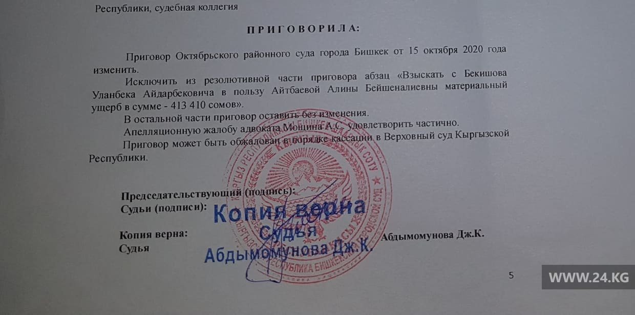 Исключен из резолютивной части приговора абзац «Взыскать с Уланбека Бекишева в пользу Алины Айтбаевой материальный ущерб в размере 413 тысяч 410 сомов.