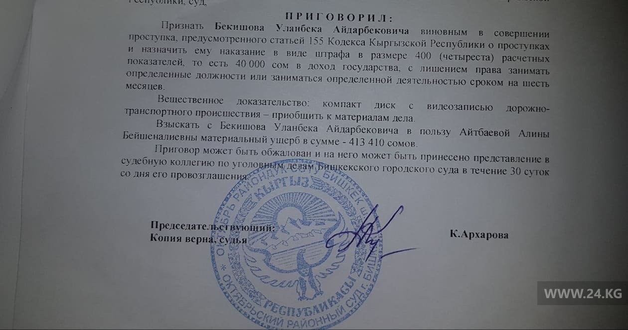 В октябре 2020 года Октябрьский районный суд признал Уланбека Бекишева виновным в совершении ДТП. Ему был назначен штраф, он также должен был выплатить ущерб пострадавшей.«Виновному назначено наказание в виде штрафа в размере 40 тысяч сомов в доход государства с лишением права занимать определенные должности или заниматься определенной деятельностью сроком на шесть месяцев. Взыскано с него в пользу Алины Айтбаевой материальный ущерб на сумму 413 тысяч 410 сомов», – уточнили в горсуде.