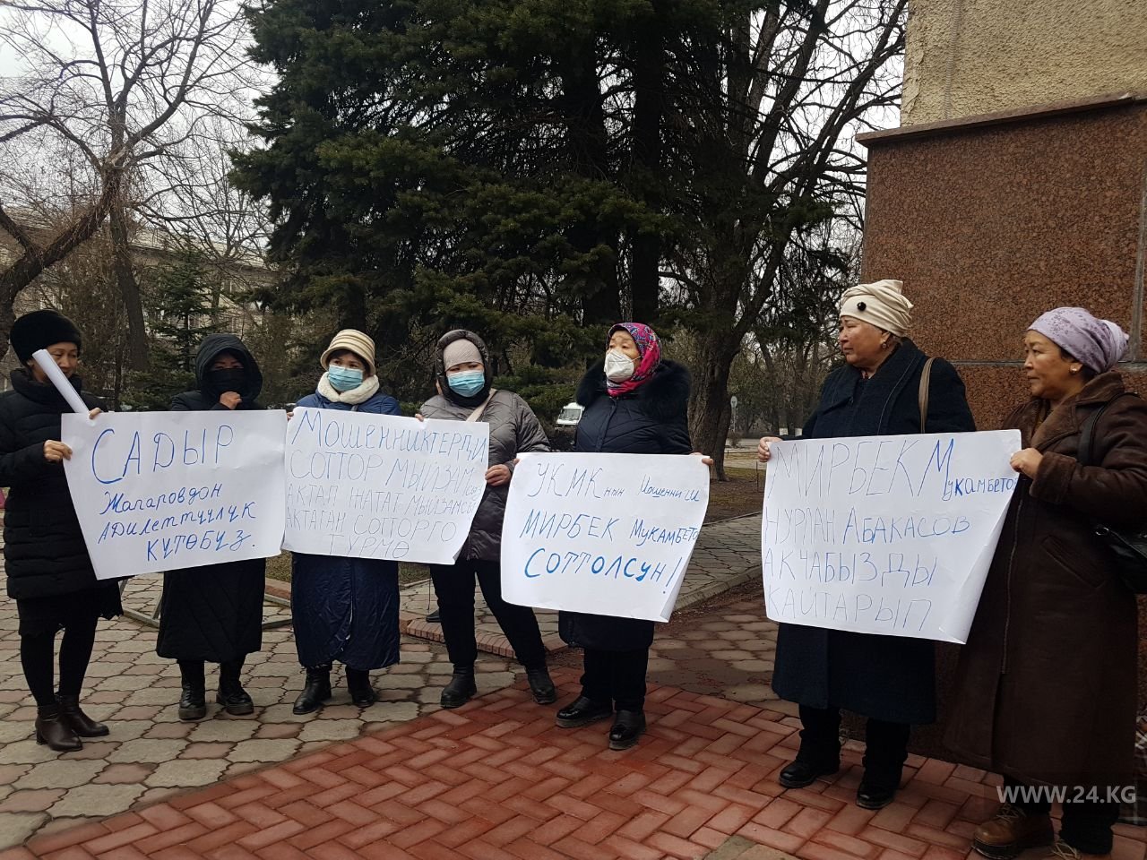 Она добавила, что дело рассматривается по второму кругу. Митингующие требуют привлечь к ответственности полковника ГКНБ Мирбека Мукамбетова, а также судей. Они просят восстановить справедливость.