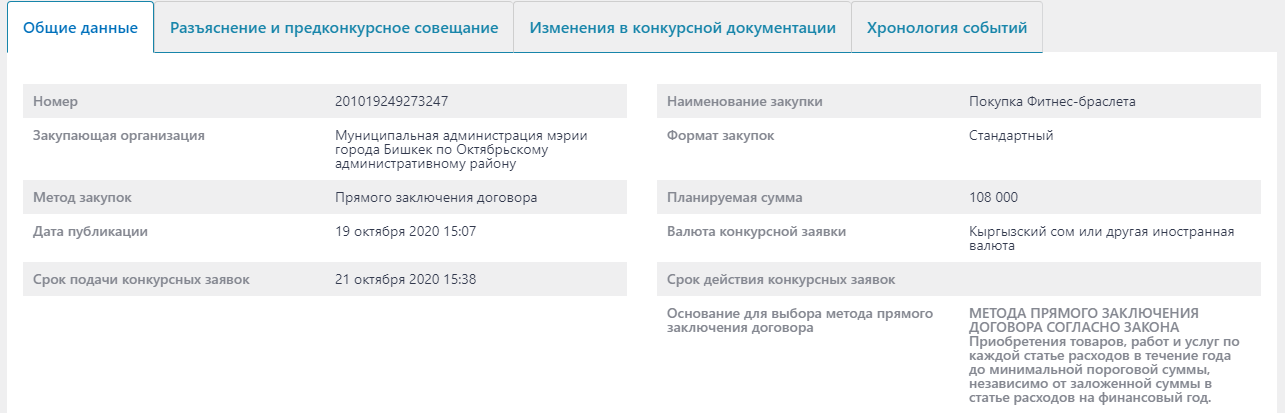 Отметим, что такой же тендер, но на меньшую сумму — 108 тысяч сомов, в октябре прошлого года объявляла администрация Октябрьского района города.