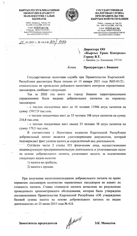 «По идее, доходы перевозчиков напрямую зависят от пассажиропотока, но опять же он нигде не учитывается, налоговая инспекция не проводит хронометраж и мониторинг. На мой запрос в ГНИ ответили, что в 2020 году территориальные подразделения в Бишкеке выдали 12 тысяч 92 добровольных патента на перевозку пассажиров на 16,3 миллиона сомов. Получается, что бюджет государства (города) пополняется только за счет приобретенных патентов. А налоги от доходов за перевозки пассажиров от юридических лиц — перевозчиков в бюджет не поступают. Тогда как в этом случае рассчитывать тариф? Управление транспорта муниципалитета пытается сделать это на основе себестоимости перевозок для отдельного владельца микроавтобуса. Но это идет в разрез с законами», — заметил Виктор Горев.