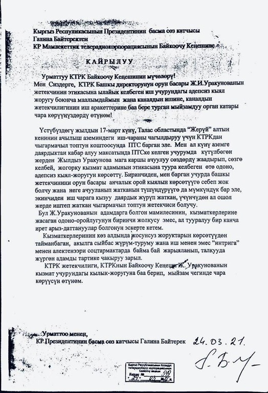 Пресс-секретарь президента Галина Байтерек пожаловалась на заместителя генерального директора ОТРК по телевещанию Жылдыз Уракунову. В своем обращении, направленном в наблюдательный совет телеканала, она попросила принять меры в отношении замдиректора.