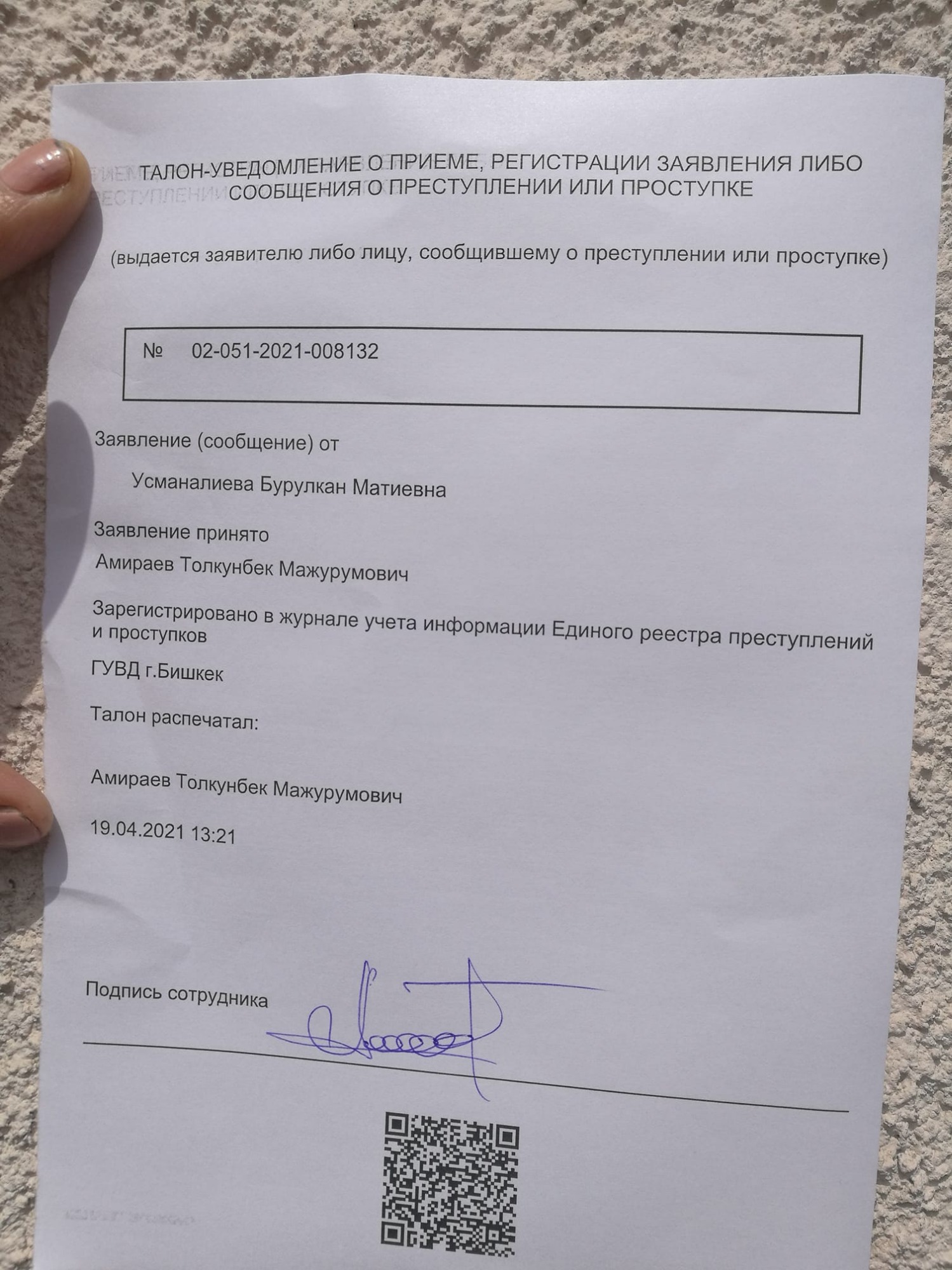 Активистка Бурул Усманалы написала заявление в ГУВД Бишкека по поводу сорвавшейся акции протеста возле МВД 15 апреля. Об этом она сообщила на Facebook.