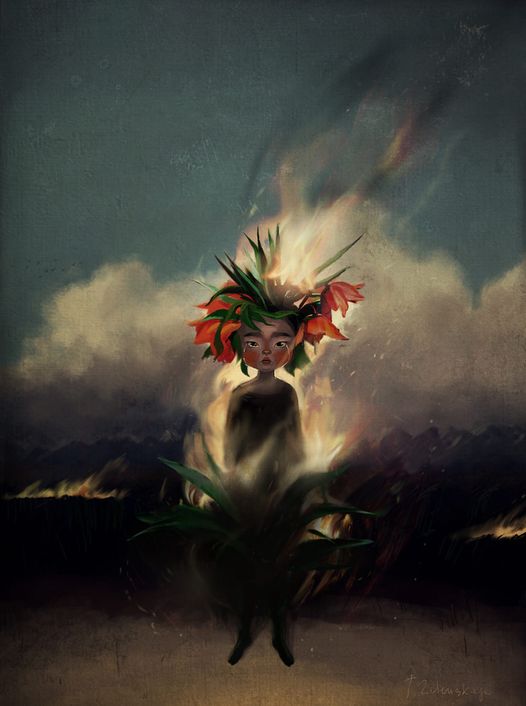 Свои эмоции она передала через образ охваченного огнем цветка Айгуль, изображенного на картине в виде плачущей девочки.