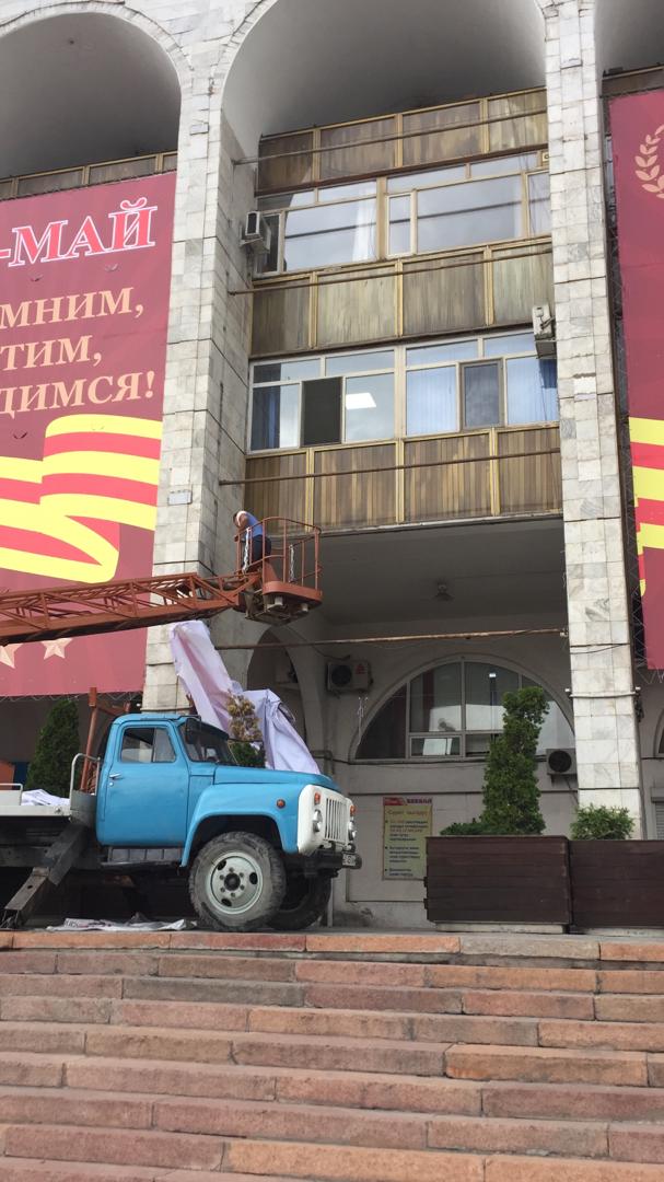 Журналист 24-kg.com поинтересовался у главы столицы, кто утверждал дизайн праздничного оформления центральной площади Ала-Тоо к 9 Мая, каким образом на баннере оказалась пропагандистская фотография гитлеровской Германии и какое наказание понесут виновные.