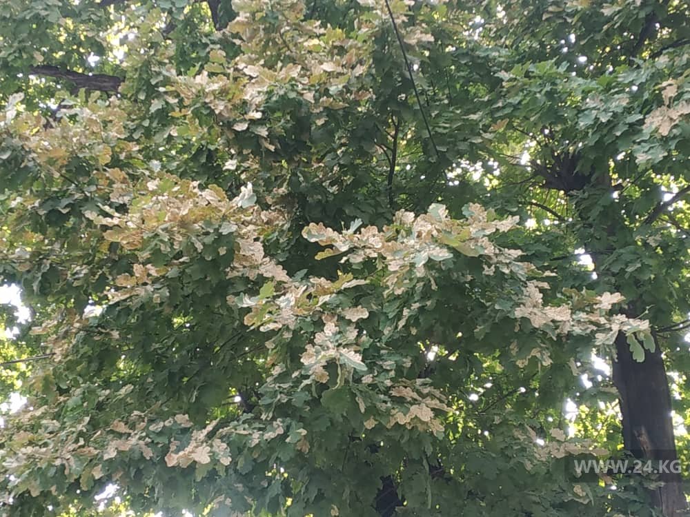 Эпопея с дубами в Бишкеке длится уже больше десяти лет. Весной 2011-го массово увеличилась численность вредителей, с которыми многолетние растения не смогли справиться. Тогда богатую листву этих деревьев насекомые уничтожили буквально за несколько недель.Это заставило руководителей служб и ведомств собраться за одним столом, чтобы выработать комплекс мер по спасению зеленых насаждений города и приграничных районов. Определить вид вредителя помогли ученые Польского института леса и Западно-Венгерского университета, им оказался дубовый минирующий пилильщик. После чего созданная рабочая группа предложила апробировать биопрепарат лепидоцид СК-М и установить феромоно-клеевые ловушки.