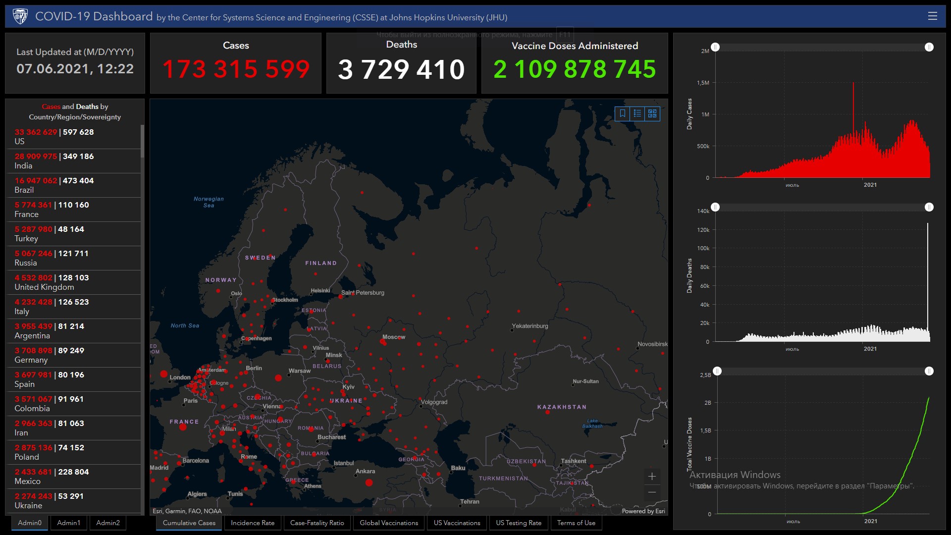 Всего в мире коронавирусом заразились 173 миллиона 315 тысяч 599 человек. Больше всего зараженных в США (33 миллиона 362 тысячи 269), Индии (28 миллионов 909 тысяч 985), Бразилии (16 миллионов 947 тысяч 62), Франции (5 миллионов 774 тысячи 361), Турции (5 миллионов 287 тысяч 980), России (5 миллионов 67 тысяч 246), Великобритании (4 миллиона 532 тысячи 802), Италии (4 миллиона 232 тысячи 428), Аргентине (3 миллиона 955 тысяч 439), Германии (3 миллиона 708 тысяч 898), Испании (3 миллиона 697 тысяч 981), Колумбии (3 миллиона 571 тысяча 67).