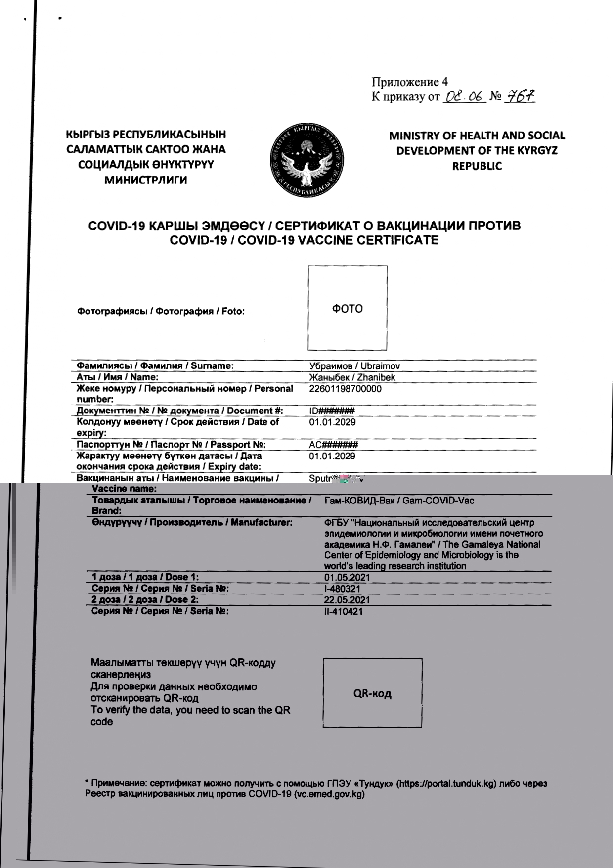 Сертификат можно получить с помощью ГПЭУ «Тундук» или через реестр вакцинированных лиц.