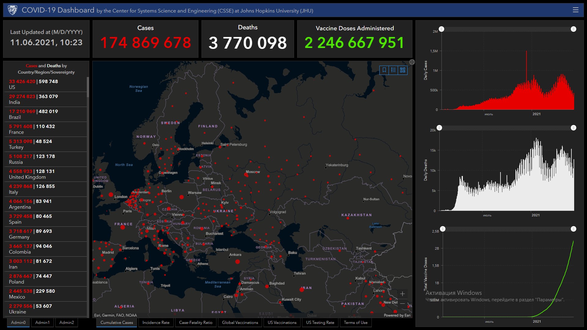 Всего в мире коронавирусом заразились 174 миллиона 869 тысяч 678 человек. Больше всего зараженных в США (33 миллиона 426 тысяч 420), Индии (29 миллионов 274 тысячи 823), Бразилии (17 миллионов 210 тысяч 969), Франции (5 миллионов 791 тысяча 608), Турции (5 миллионов 313 тысяч 98), России (5 миллионов 108 тысяч 217), Великобритании (4 миллиона 558 тысяч 933), Италии (4 миллиона 239 тысяч 868), Аргентине (4 миллиона 66 тысяч 156), Испании (3 миллиона 729 тысяч 458), Германии (3 миллиона 718 тысяч 617), Колумбии (3 миллиона 665 тысяч 137).