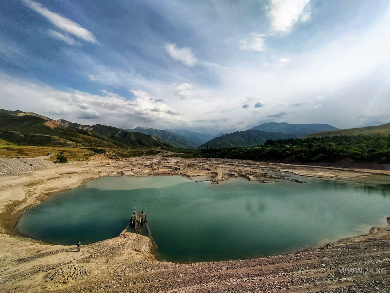 Это замысловатое сооружение, которое на окраине Бишкека могут увидеть те, кто направляется в Аламединское ущелье, на самом деле не водохранилище, и даже не водозабор. Главная задача Аламединского отстойника — очищать от ила и глины воду, поступающую из одноименной реки, прежде чем она попадет на поля и в ирригационную систему столицы.
