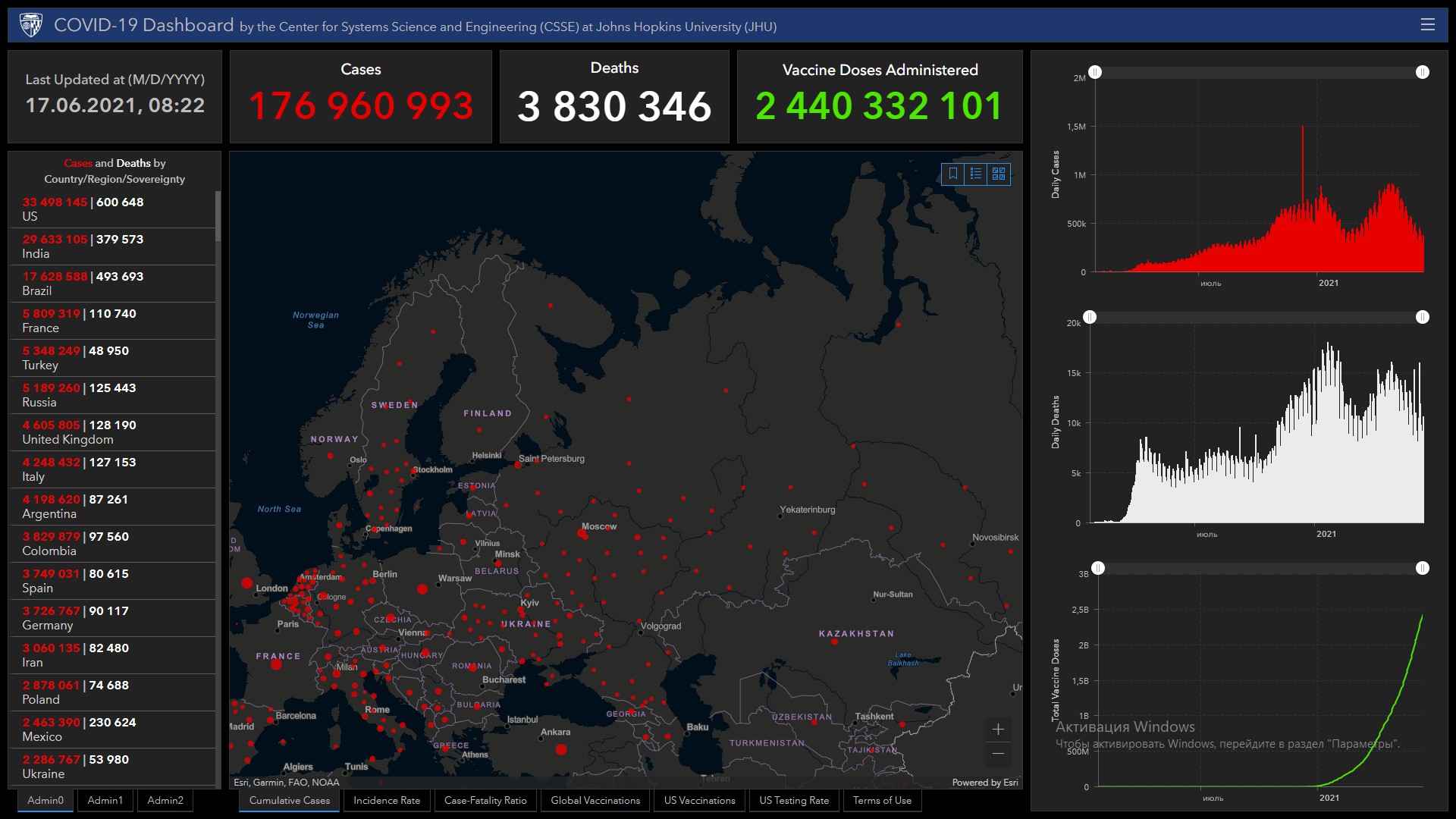Всего в мире коронавирусом заразились 176 миллионов 960 тысяч 993 человека. Больше всего зараженных в США (33 миллиона 498 тысяч 145), Индии (29 миллионов 633 тысячи 105), Бразилии (17 миллионов 628 тысяч 588), Франции (5 миллионов 809 тысяч 319), Турции (5 миллионов 348 тысяч 249), России (5 миллионов 189 тысяч 260), Великобритании (4 миллиона 605 тысяч 805), Италии (4 миллиона 248 тысяч 432), Аргентине (4 миллиона 198 тысяч 620), Колумбии (3 миллиона 829 тысяч 879), Испании (3 миллиона 749 тысяч 31) и Германии (3 миллиона 726 тысяч 767).
