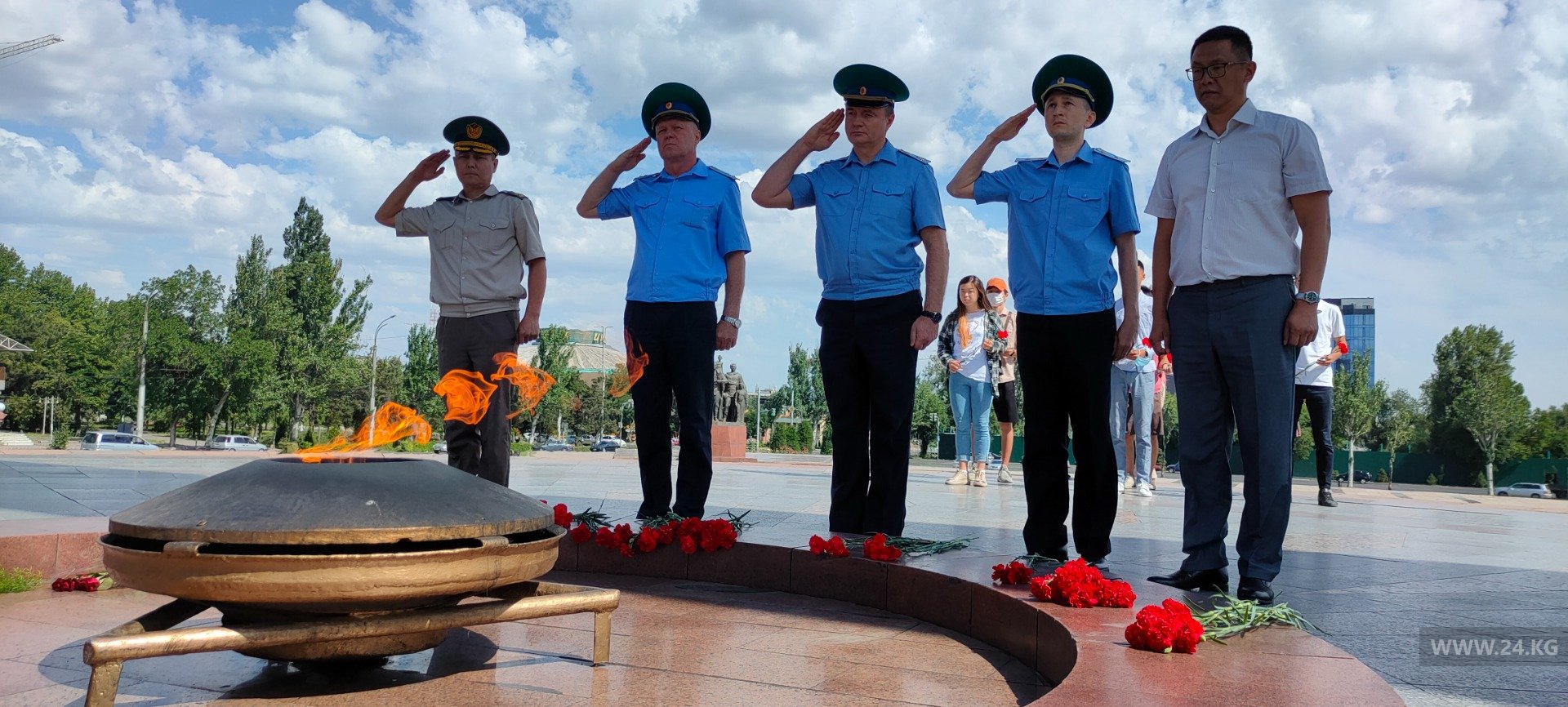 Сегодня на площади Победы ветераны организации вооруженных сил страны возложили цветы к Вечному огню на Старой площади в Бишкеке по случаю Дня скорби. Восемьдесят лет назад, в 1941 году, фашистские войска развязали войну.