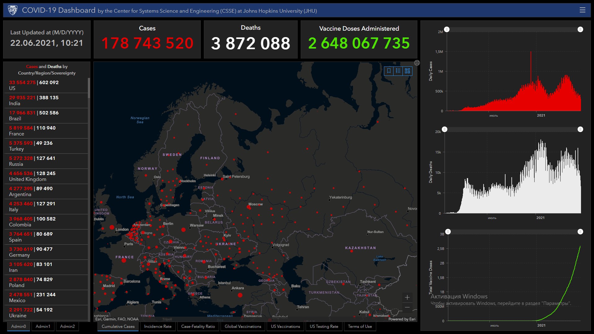 COVID-19 в мире. Заразились более 178,7 миллиона, умерли более 3,8 миллиона