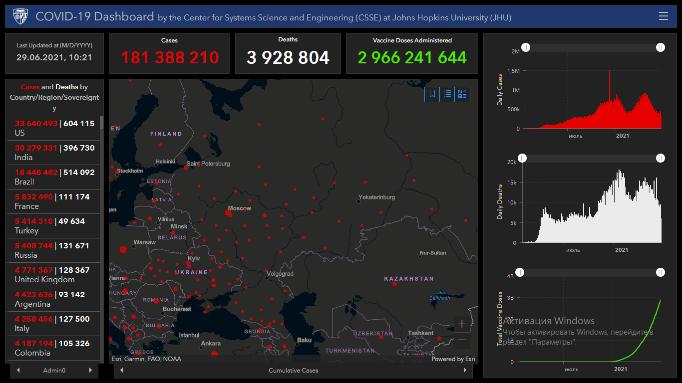 Всего в мире коронавирусом заразились 181 миллион 388 тысяч 210 человек. Больше всего зараженных в США (33 миллиона 640 тысяч 493), Индии (30 миллионов 279 тысяч 331), Бразилии (18 миллионов 448 тысяч 402), Франции (5 миллионов 832 тысячи 490), Турции (5 миллионов 414 тысяч 310), России (5 миллионов 408 тысяч 744), Великобритании (4 миллиона 771 тысяча 367), Аргентине (4 миллиона 423 тысячи 636), Италии (4 миллиона 258 тысяч 456), Колумбии (4 миллиона 187 тысяч 194), Испании (3 миллиона 792 тысячи 642) и Германии (3 миллиона 734 тысячи 830).
