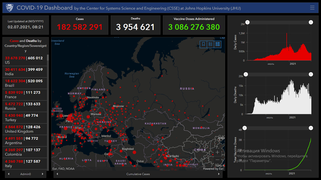 COVID-19 в мире. Заразились более 182,5 миллиона, умерли более 3,9 миллиона
