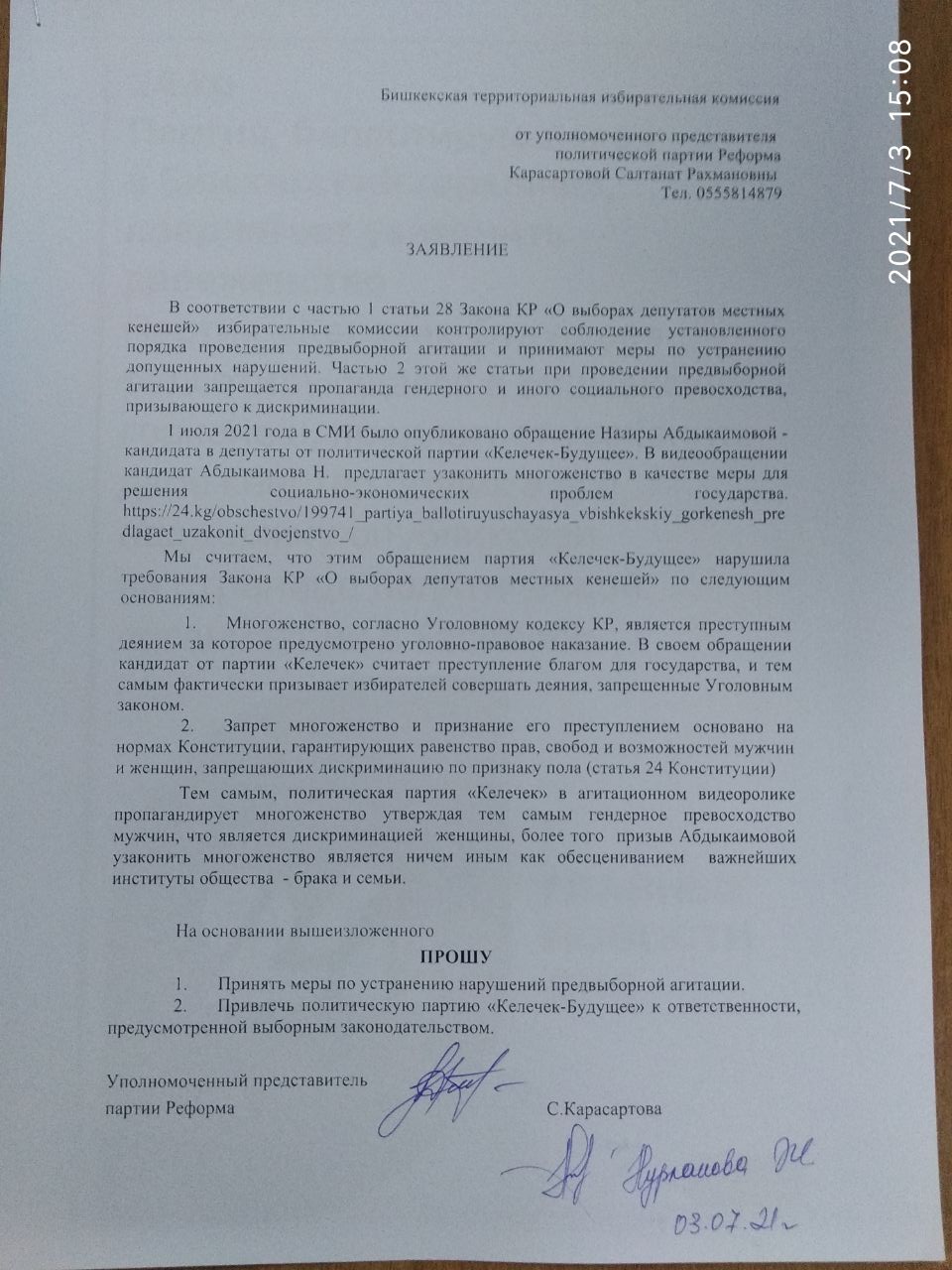 По словам партии конкурентов, этим обращением «Келечек-Будущее» нарушила Закон КР «О выборах депутатов местных кенешей» по следующим основаниям: