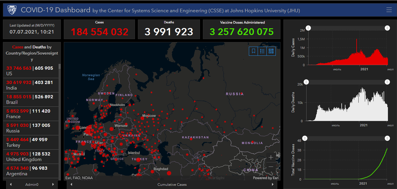 Всего в мире коронавирусом заразились 184 миллиона 554 тысячи 32 человека. Больше всего зараженных в США (33 миллиона 746 тысяч 563), Индии (30 миллионов 619 тысяч 932), Бразилии (18 миллионов 855 тысяч 15), Франции (5 миллионов 852 тысячи 599), России (5 миллионов 591 тысяча 30), Турции (5 миллионов 449 тысяч 464), Великобритании (4 миллиона 975 тысяч 903), Аргентине (4 миллиона 574 тысячи 340), Колумбии (4 миллиона 402 тысячи 582), Италии (4 миллиона 264 тысячи 704), Испании (3 миллиона 880 тысяч 612) и Германии (3 миллиона 739 тысяч 575).
