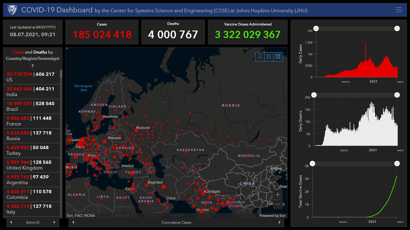 Всего в мире коронавирусом заразились 185 миллионов 24 тысячи 418 человек. Больше всего зараженных в США (33 миллиона 770 тысяч 334), Индии (30 миллионов 663 тысячи 665), Бразилии (18 миллионов 909 тысяч 37), Франции (5 миллионов 856 тысяч 682), России (5 миллионов 614 тысяч 540), Турции (5 миллионов 459 тысяч 923), Великобритании (5 миллионов 7 тысяч 964), Аргентине (4 миллиона 593 тысячи 763), Колумбии (4 миллиона 426 тысяч 811), Италии (4 миллиона 265 тысяч 814), Испании (3 миллиона 897 тысяч 996) и Германии (3 миллиона 740 тысяч 567).
