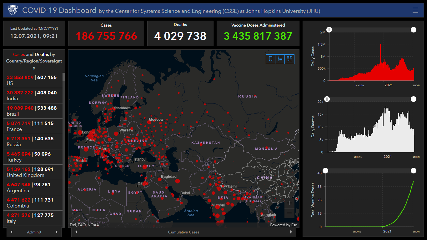 Всего в мире коронавирусом заразились 186 миллионов 755 тысяч 766 человек. Больше всего зараженных в США (33 миллиона 853 тысячи 809), Индии (30 миллионов 837 тысяч 222), Бразилии (19 миллионов 89 тысяч 940), Франции (5 миллионов 874 тысячи 719), России (5 миллионов 713 тысяч 351), Турции (5 миллионов 465 тысяч 94), Великобритании (5 миллионов 136 тысяч 162), Аргентине (4 миллиона 647 тысяч 948), Колумбии (4 миллиона 471 тысяча 622), Италии (4 миллиона 271 тысяча 276), Испании (3 миллиона 937 тысяч 192) и Германии (3 миллиона 743 тысячи 732).