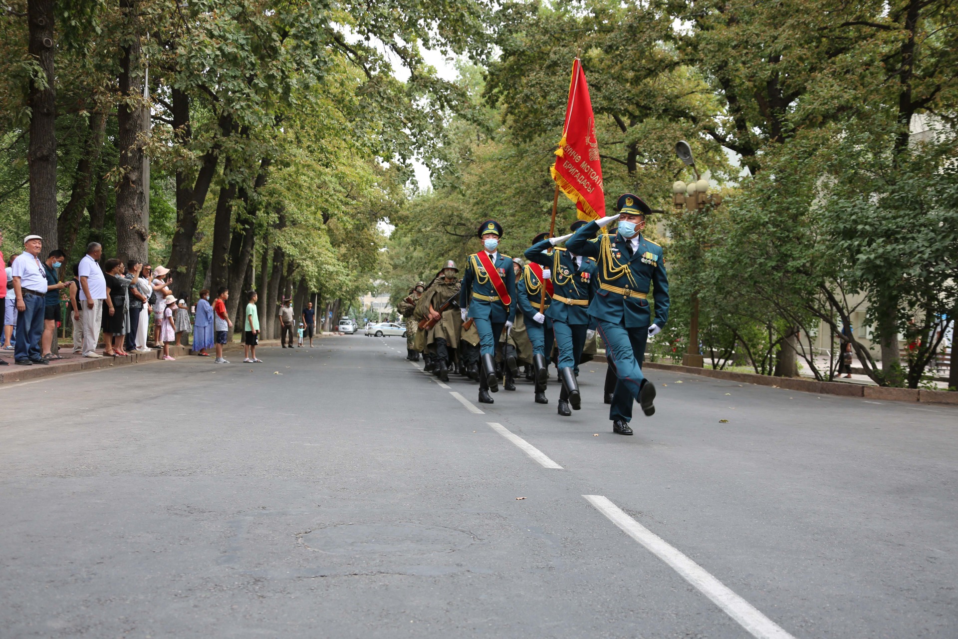 Гвардейцы Панфиловской дивизии прошли маршем от Генерального штаба до парка имени Панфилова. Митинг-реквием начался с возложения цветов к памятнику Ивану Панфилову.