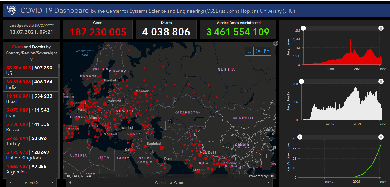 Всего в мире коронавирусом заразились 187 миллионов 230 тысяч 5 человек. Больше всего зараженных в США (33 миллиона 886 тысяч 515), Индии (30 миллионов 874 тысячи 376), Бразилии (19 миллионов 106 тысяч 971), Франции (5 миллионов 875 тысяч 987), России (5 миллионов 738 тысяч), Турции (5 миллионов 465 тысяч 94), Великобритании (5 миллионов 173 тысячи 972), Аргентине (4 миллиона 662 тысячи 937), Колумбии (4 миллиона 530 тысяч 610), Италии (4 миллиона 272 тысячи 163), Испании (3 миллиона 971 тысяча 124) и Германии (3 миллиона 744 тысячи 285).