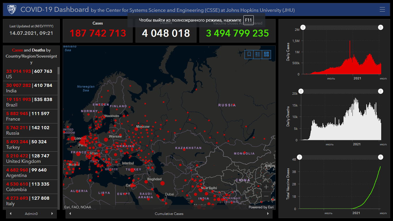 Всего в мире коронавирусом заразились 187 миллионов 742 тысячи 713 человек. Больше всего зараженных в США (33 миллиона 914 тысяч 193), Индии (30 миллионов 907 тысяч 282), Бразилии (19 миллионов 151 тысяча 993), Франции (5 миллионов 882 тысячи 945), России (5 миллионов 762 тысячи 211), Турции (5 миллионов 493 тысячи 244), Великобритании (5 миллионов 210 тысяч 472), Аргентине (4 миллиона 682 тысячи 960), Колумбии (4 миллиона 530 тысяч 610), Италии (4 миллиона 273 тысячи 693), Испании (4 миллиона 15 тысяч 84) и Германии (3 миллиона 745 тысяч 312).