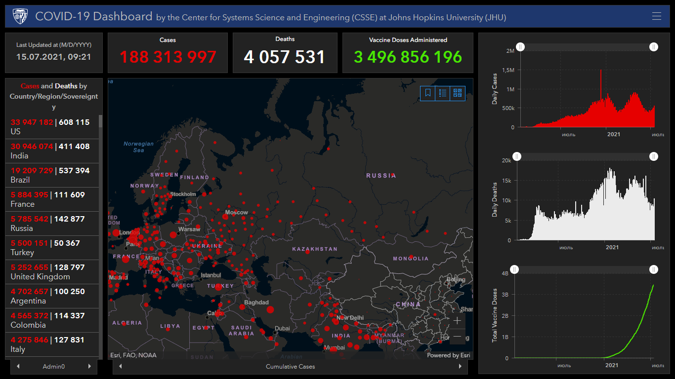 COVID-19 в мире. Заразились более 188,3 миллиона, умерли более 4 миллионов