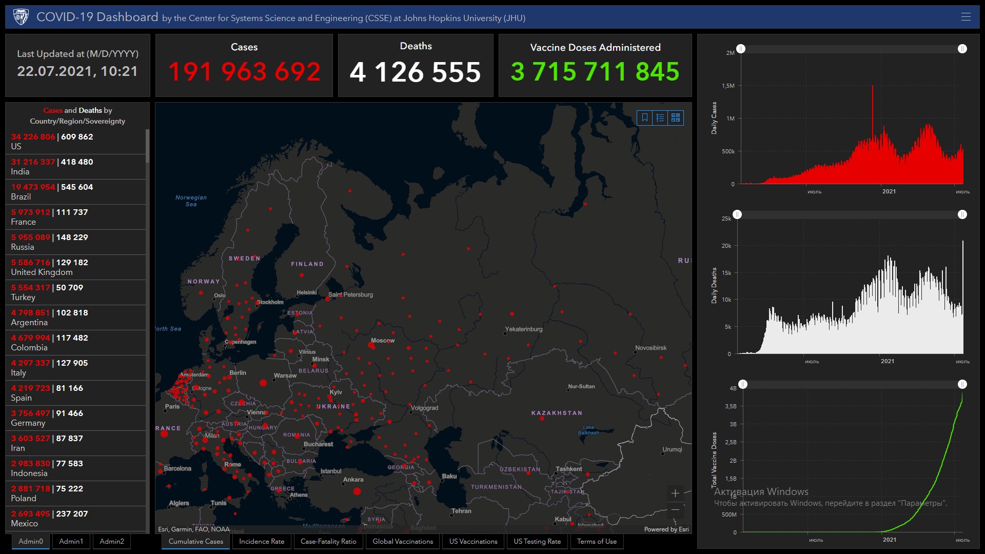 COVID-19 в мире. Заразились более 191,4 миллиона, умерли более 4,1 миллиона