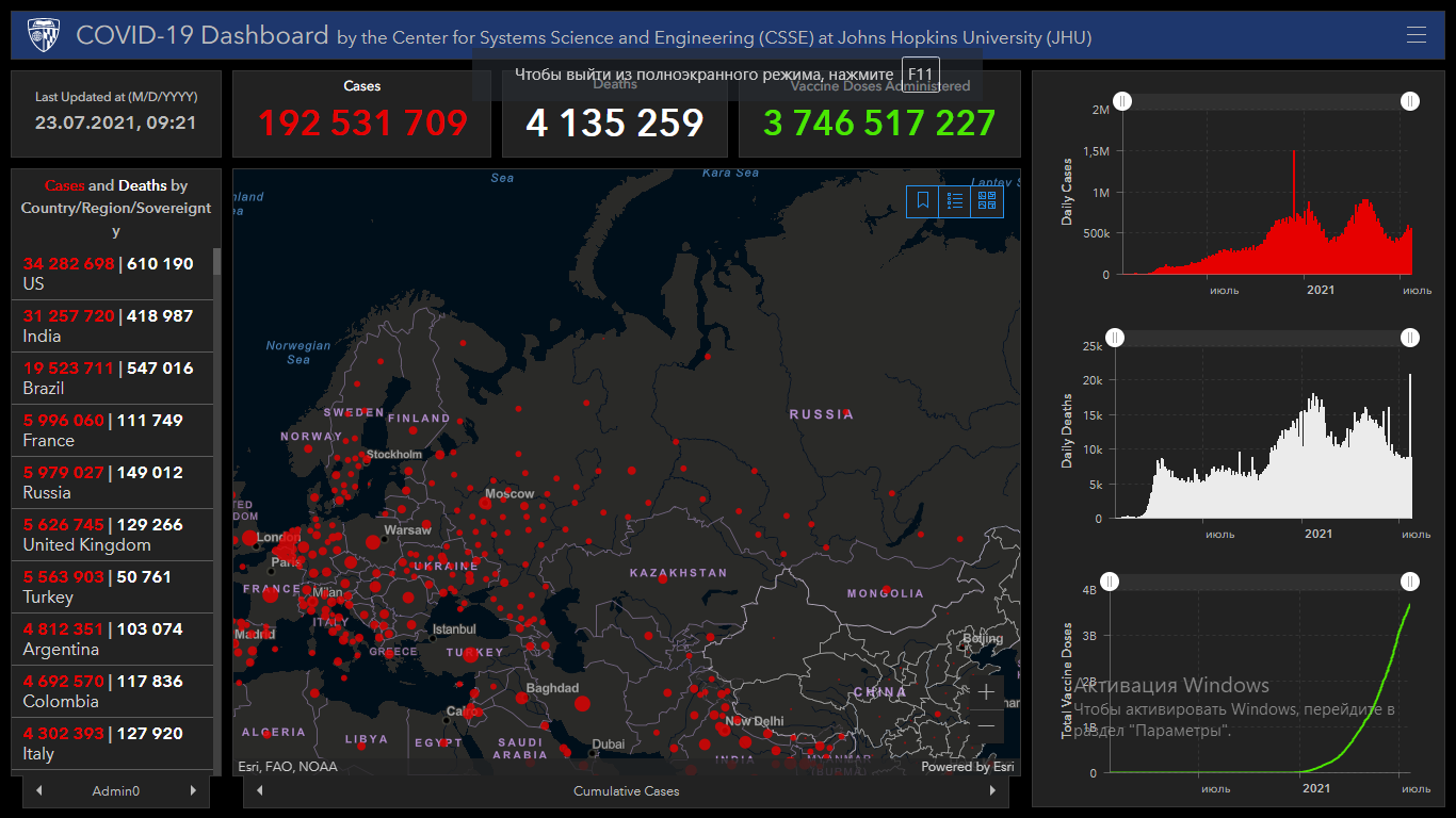 Всего в мире коронавирусом заразились 192 миллиона 531 тысяча 709 человек. Больше всего зараженных в США (34 миллиона 282 тысячи 698), Индии (31 миллион 257 тысяч 720), Бразилии (19 миллионов 523 тысячи 711), Франции (5 миллионов 996 тысяч 60), России (5 миллионов 979 тысяч 27), Великобритании (5 миллионов 626 тысяч 745), Турции (5 миллионов 563 тысячи 903), Аргентине (4 миллиона 812 тысяч 351), Колумбии (4 миллиона 692 тысячи 570), Италии (4 миллиона 302 тысячи 393), Испании (4 миллиона 249 тысяч 258) и Германии (3 миллиона 758 тысяч 425).