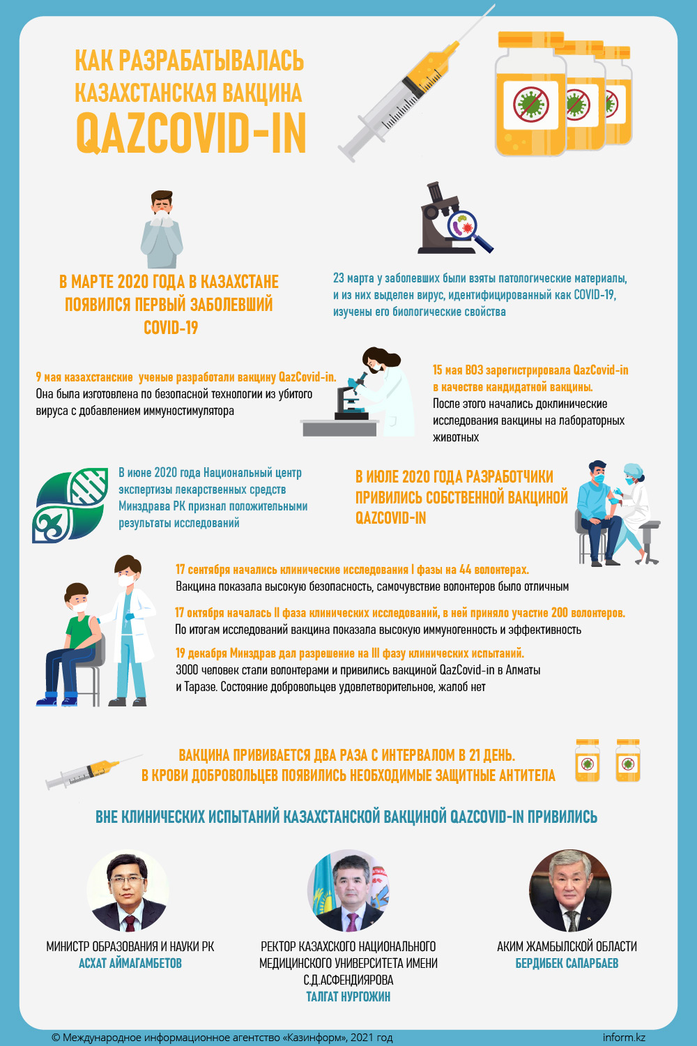 «Клинические испытания и практика ее применения в Казахстане показали безопасность вакцины QazVac и ее эффективность (свыше 90 процентов) в предотвращении заражения коронавирусной инфекцией и ее тяжелых форм», — говорится в сообщении.