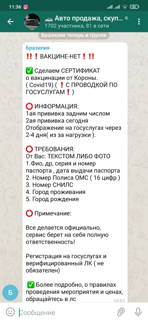 Отметим, что в мессенджерах кыргызстанцы получают рассылку о подделке сертификатов о вакцинации. Для этого необходимо предоставить паспорт и номер СНИЛС (страховой номер индивидуального лицевого счета). Очевидно, речь идет о России. Там добровольно-принудительная вакцинация вызвала ажиотажный спрос на фальшивые сертификаты.