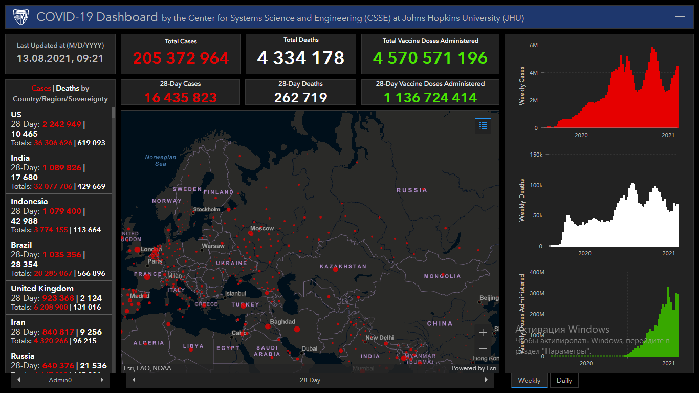 Всего в мире коронавирусом заразились 205 миллионов 372 тысячи 964 человека. Больше всего зараженных в США (36 миллионов 306 тысяч 626), Индии (32 миллиона 77 тысяч 706), Бразилии (20 миллионов 285 тысяч 67), Франции (6 миллионов 469 тысяч 753), России (6 миллионов 447 тысяч 229), Великобритании (6 миллионов 208 тысяч 908), Турции (6 миллионов 18 тысяч 455), Аргентине (5 миллионов 66 тысяч 253), Колумбии (4 миллиона 856 тысяч 595), Испании (4 миллиона 677 тысяч 883), Италии (4 миллиона 420 тысяч 429), Иране (4 миллиона 320 тысяч 266) и Германии (3 миллиона 814 тысяч 335).