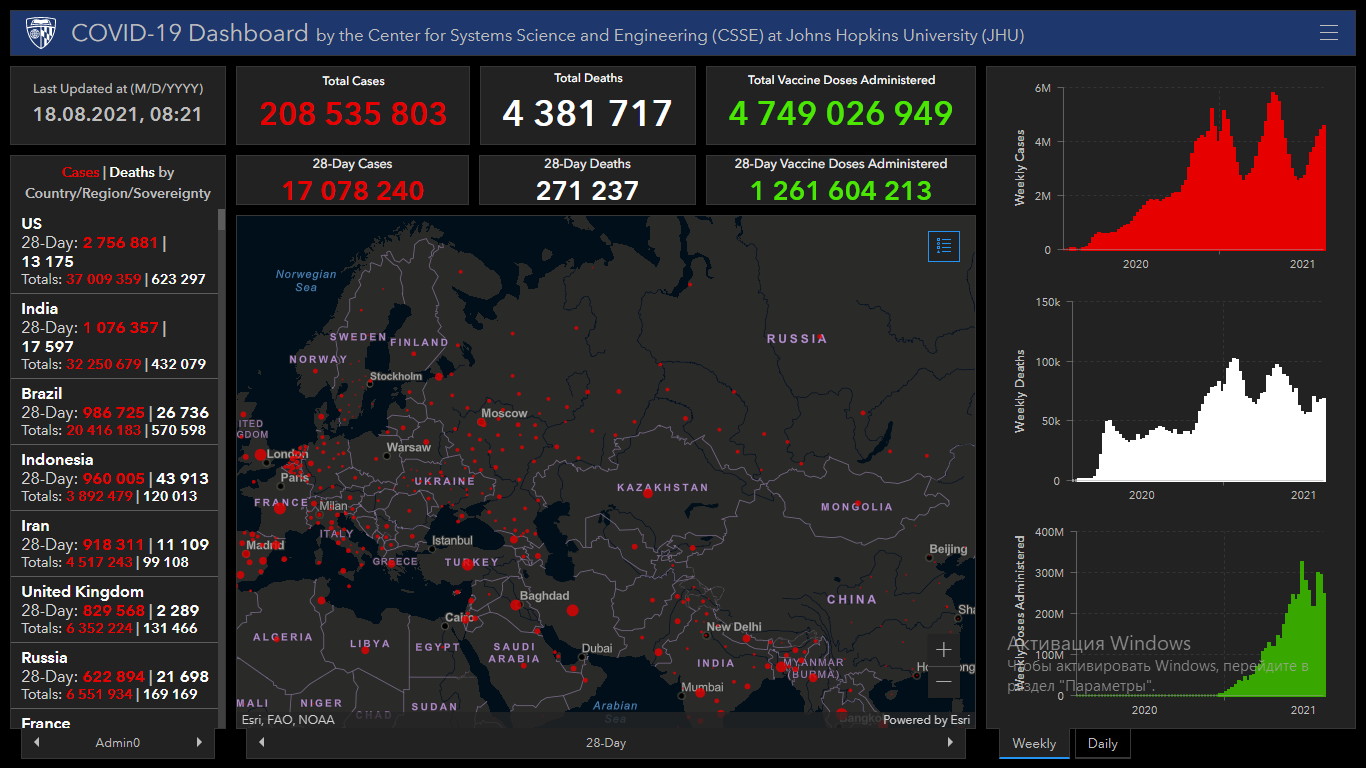 Всего в мире коронавирусом заразились 208 миллионов 535 тысяч 803 человека. Больше всего зараженных в США (37 миллионов 9 тысяч 359), Индии (32 миллиона 250 тысяч 679), Бразилии (20 миллионов 416 тысяч 183), Франции (6 миллионов 581 тысяча 417), России (6 миллионов 551 тысяча 934), Великобритании (6 миллионов 352 тысячи 224), Турции (6 миллионов 118 тысяч 478), Аргентине (5 миллионов 96 тысяч 443), Колумбии (4 миллиона 874 тысячи 169), Испании (4 миллиона 733 тысячи 602), Италии (4 миллиона 449 тысяч 606), Иране (4 миллиона 517 тысяч 243) и Германии (3 миллиона 837 тысяч 218).