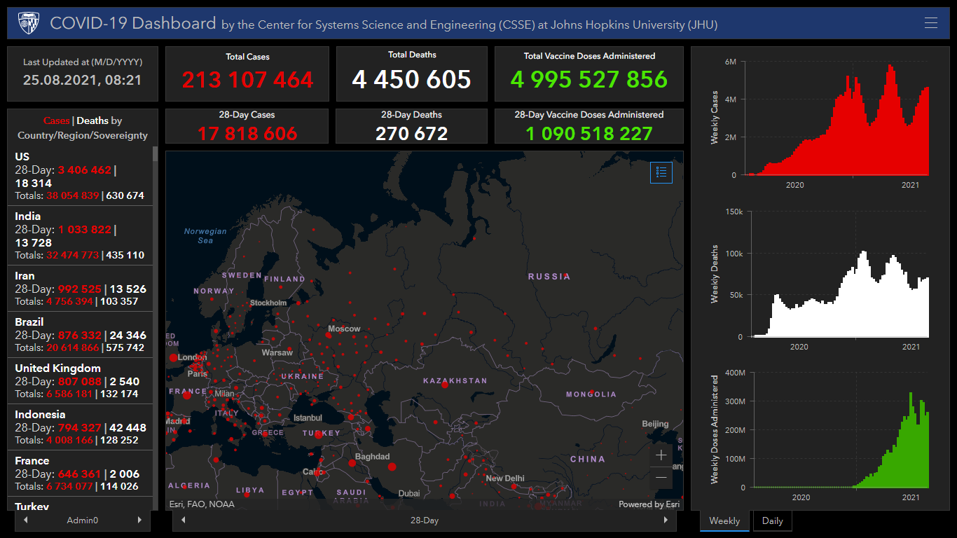 Всего в мире коронавирусом заразились 213 миллионов 107 тысяч 464 человека. Больше всего зараженных в США (38 миллионов 54 тысячи 839), Индии (32 миллиона 474 тысячи 773), Бразилии (20 миллионов 614 тысяч 866), Франции (6 миллионов 734 тысячи 77), России (6 миллионов 690 тысяч 633), Великобритании (6 миллионов 586 тысяч 181), Турции (6 миллионов 253 тысячи 681), Аргентине (5 миллионов 148 тысяч 85), Колумбии (4 миллиона 894 тысячи 702), Испании (4 миллиона 804 тысячи 424), Италии (4 миллиона 494 тысячи 857), Иране (4 миллиона 756 тысяч 394) и Германии (3 миллиона 889 тысяч 364).