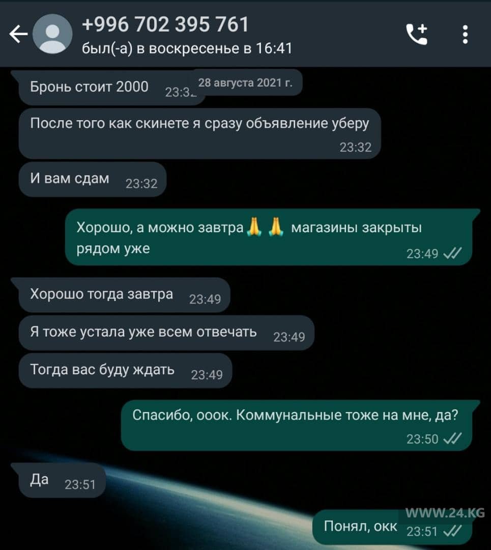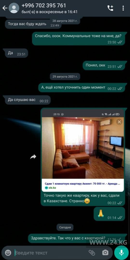 «Как только переведете деньги, объявление уберу, а жилье сдам вам», — заверил собеседник. После еще нескольких бессмысленных сообщений отправляю скриншот точной копии квартиры из Казахстана и интересуюсь, совпадение ли.