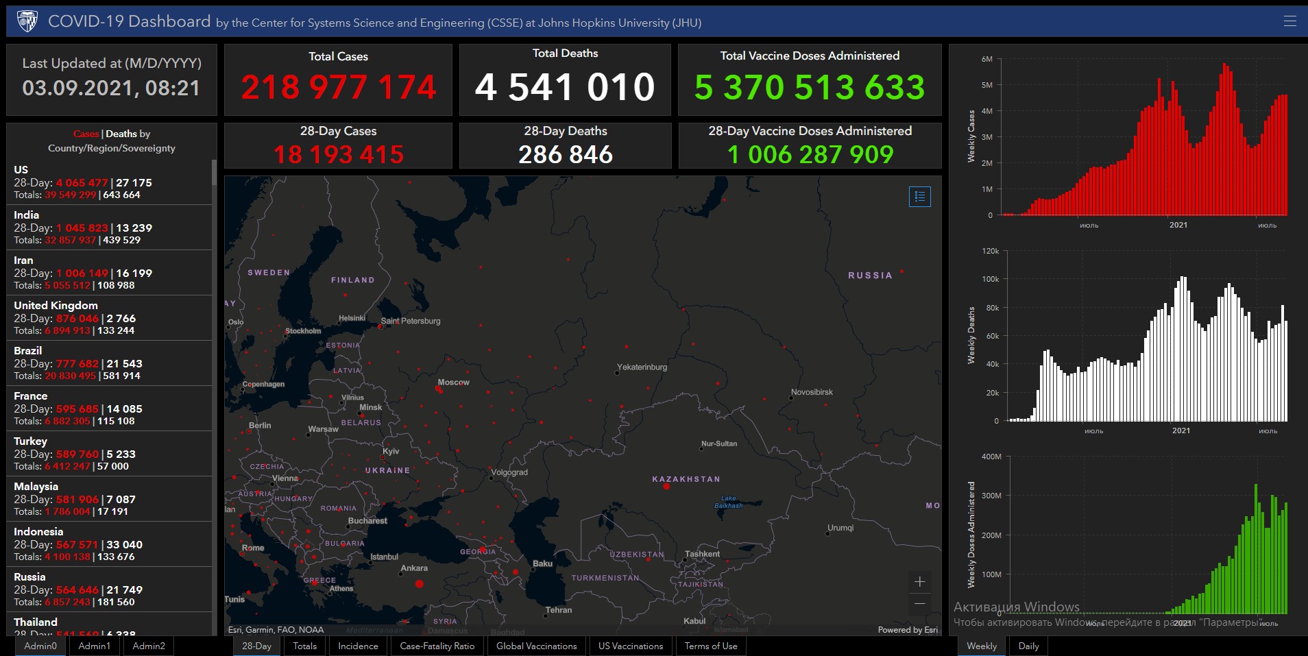COVID-19 в мире. Заразились более 218,9 миллиона, умерли более 4,5 миллиона